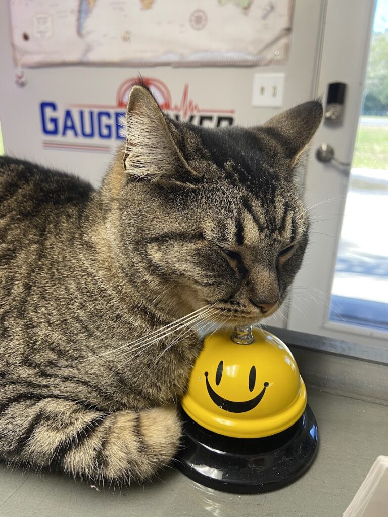 Five wandered up to the shop skinny and flea-ridden, but now shes getting lots of love and food from the GaugeSaver team. If you stop by, she will be patiently waiting on the counter for some attention!!